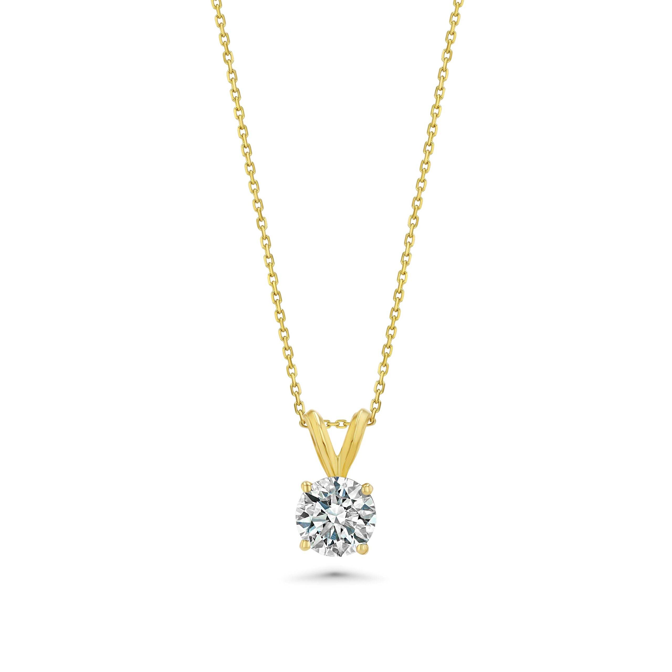 This pendant features 1.25 ct of round brilliant diamond weight, showcased in a classic four‑prong 14K yellow gold setting. The bright, carefully selected diamond delivers strong fire and scintillation against the warm glow of yellow gold. A graceful V‑style bail connects seamlessly to the included fine gold chain, so the necklace sits centered and comfortable on the neckline. Ideal for everyday wear, gifting, or bridal jewelry, it layers beautifully yet stands out on its own. This elevated solitaire design offers a timeless, high‑impact look at an approachable price point.
