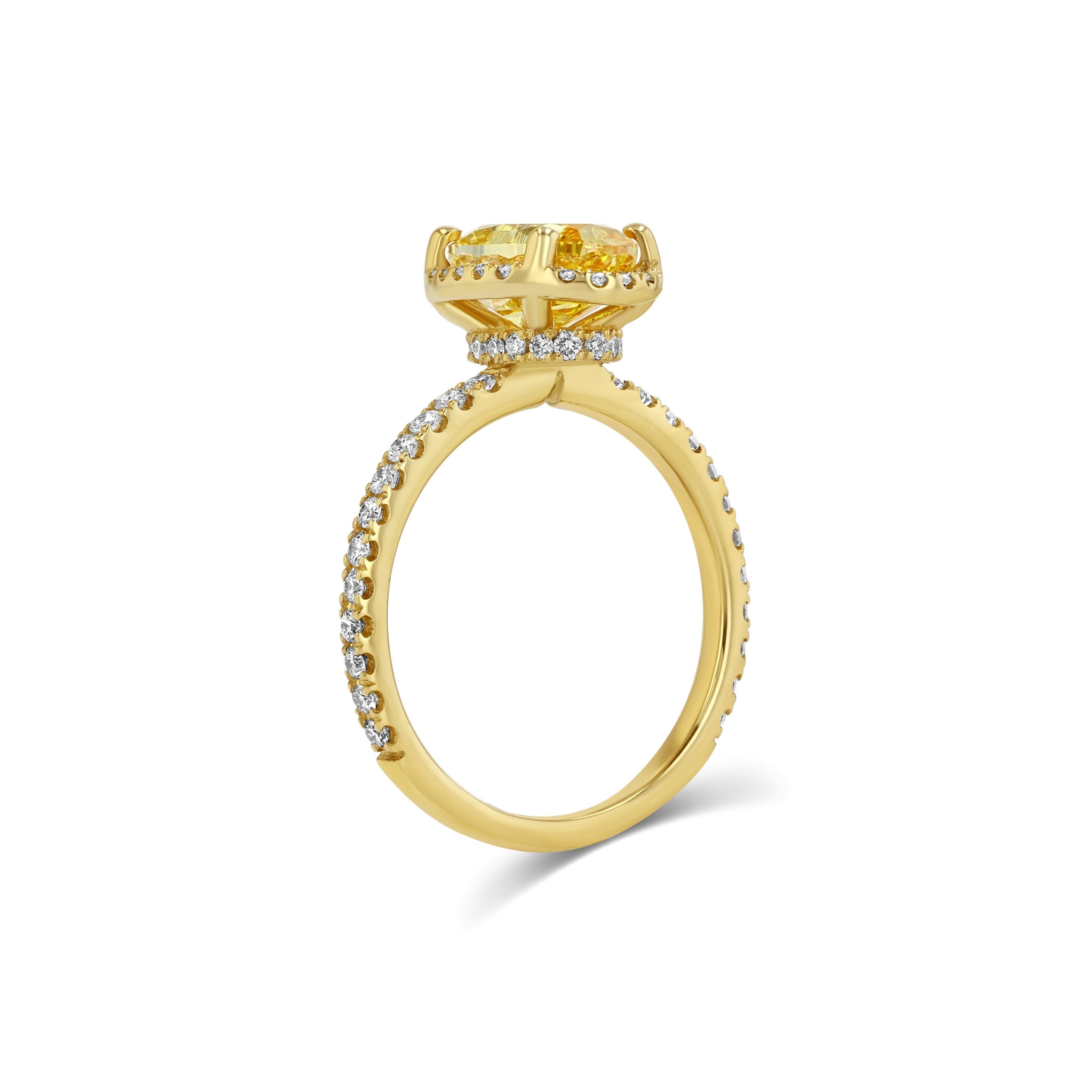 This elegant ring centers a radiant 2.58 ct oval yellow diamond that instantly draws the eye with its vivid color and brilliance. A finely set halo of round diamonds surrounds the center stone, enhancing its size and sparkle. Additional round diamonds extend along the slim 14K yellow gold band in graduated sizes, with 62 stones totaling approximately 0.52 ct for a continuous shimmer. The combination of warm yellow gold and the vibrant yellow diamond creates a rich, modern look while retaining timeless appeal. Perfect as a standout engagement ring or a special occasion piece, it offers refined luxury with everyday wearability.